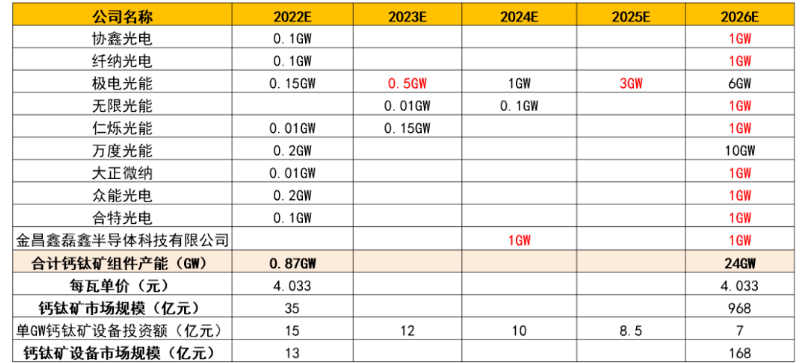 协鑫光电、纤纳光电、极电光能、无限光能、仁烁光能、万度光能、大正微纳、众能光电、合特光电、金昌鑫磊鑫半导体、宁德时代等均在布局钙钛矿相关产能。我们统计测算得到,22/26年钙钛矿组件产能预计分别为0.87GW/24GW,2023年有望形成>1GW钙钛矿组件产能。
