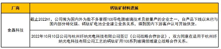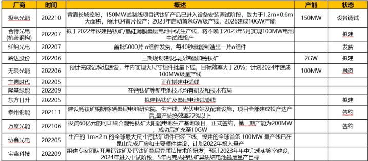 根据各家已公开钙钛矿产能情况,统计下表: