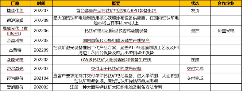目前,国内钙钛矿电池厂商包括专攻钙钛矿领域的极电光能、合特光电、无限光能等,传统电池片厂商布局钙钛矿领域的有东方日升、泰州锦能,跨界布局的有宁德时代等。