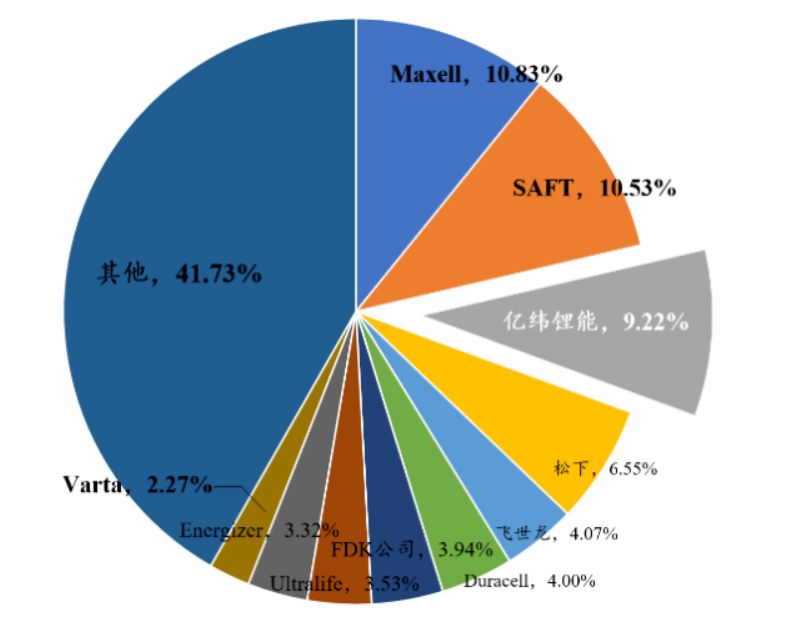 2008年亿纬锂能所研发的锂亚电池已占据国内市场39%份额,成为中国最大、世界第五的锂亚电池供应商。