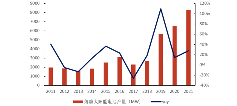 随着占主流市场的晶硅电池的发展,其光电转化效率(26.7%)已接近理论极限(29.4%),难以进一步发展。薄膜电池凭着其高理论转换效率和低廉的成本有望成为光伏市场的又一新的增长点。2021 年全球薄膜电池产量约为 8.28GW,同比增长27.7%。