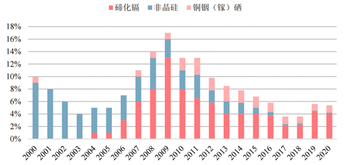 图2.不同类型薄膜电池占全部光伏组件市场份额变化