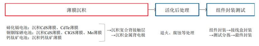薄膜沉积主要是为制备光电转换各层介质;活化后处理是经过退火、腐蚀等处理提高组件性能;组件封装是保证组件使用寿命的关键环节,包括组件封装、接线盒封装、测试分拣、最终封装。