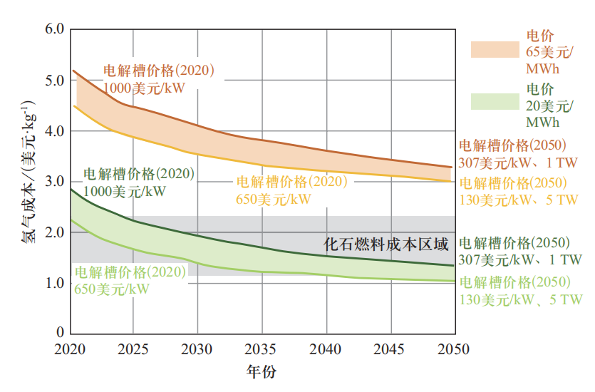 计算假设:2020年产氢能耗51.2 kWh/kg,2050年产氢能耗43.8 kWh/ kg,折旧率8%,电解槽寿命80 000 h,2020年电解槽设备成本为650~1000美 元/kW,2050年成本为130~307美元/kW,且部署容量为1~5 TW。