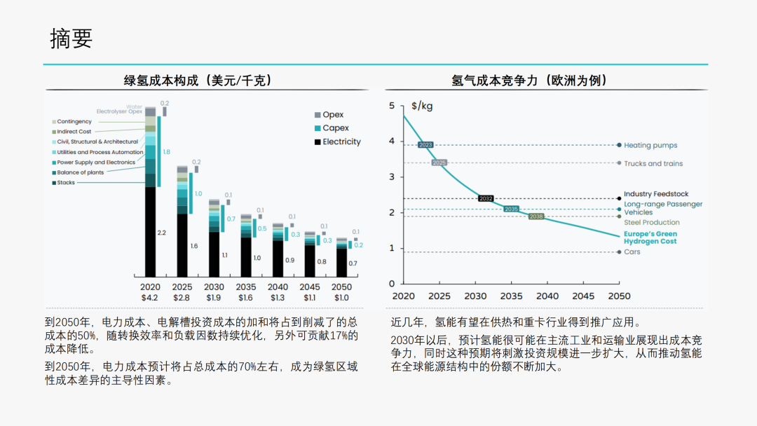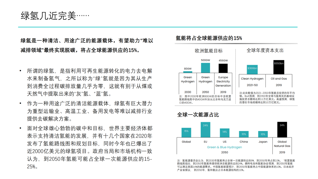 1. 绿氢的制备来源于可再生能源生产的电力,以清洁、用途广泛为显著特点,助力难以脱碳行业的实现去碳化,预计到2050年将占全球一次能源供应的15%。