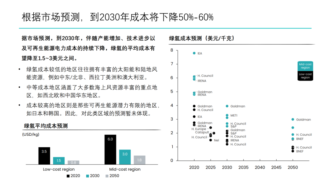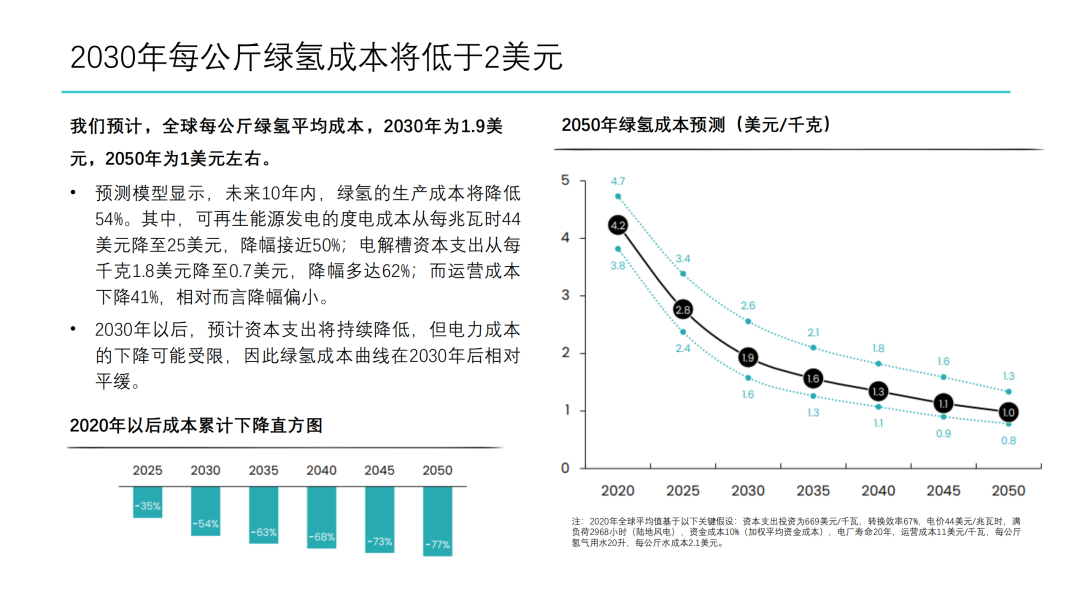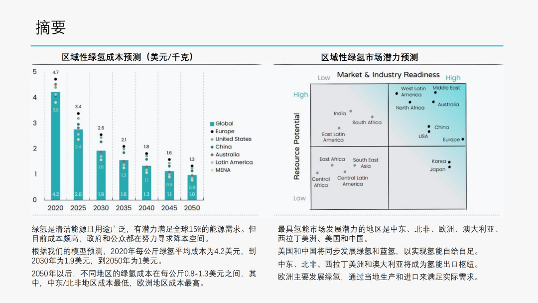2. 根据我们的模型预测,2020年绿氢成本每公斤4.2美元,2030年为1.9美元,2050年为1美元。分区域的绿氢价格介于0.8美元到1.3美元之间,中东/北非价格最低,欧洲价格最高。