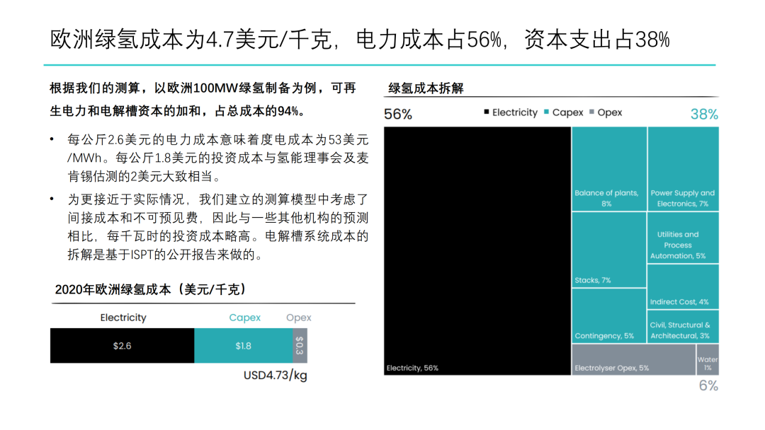 5. 2020年生产绿氢的电力成本平均为44美元/兆瓦时,占到总成本的56%,平准化度电成本在近几年将大幅下降,之后趋于平稳。2050年电力成本预计为17美元/兆瓦时,占到生产绿氢总成本的70%,因此电力成本差异将直接导致绿氢成本存在地区性差异。