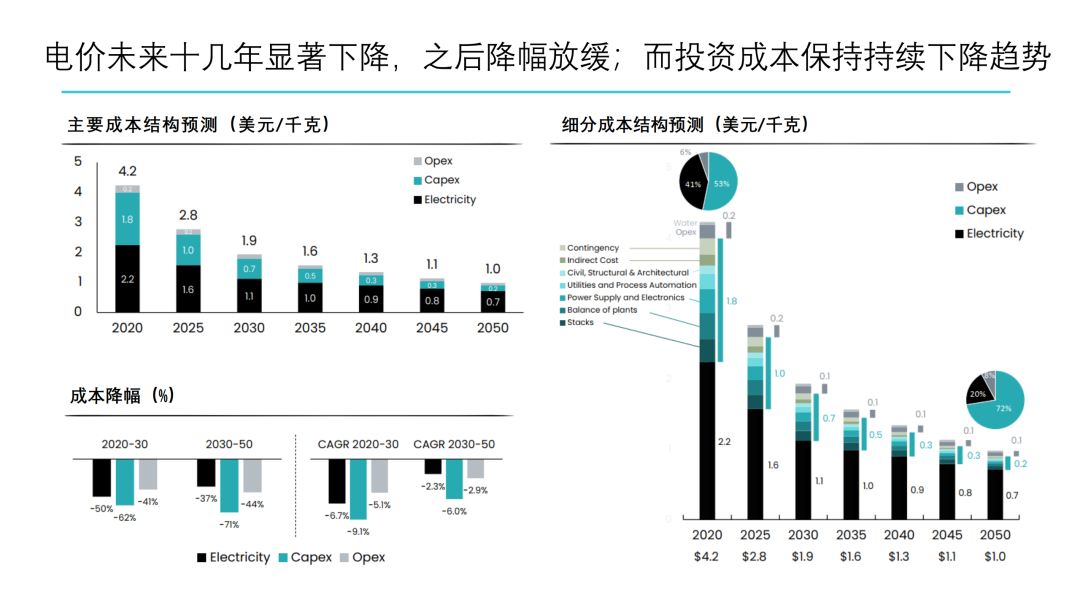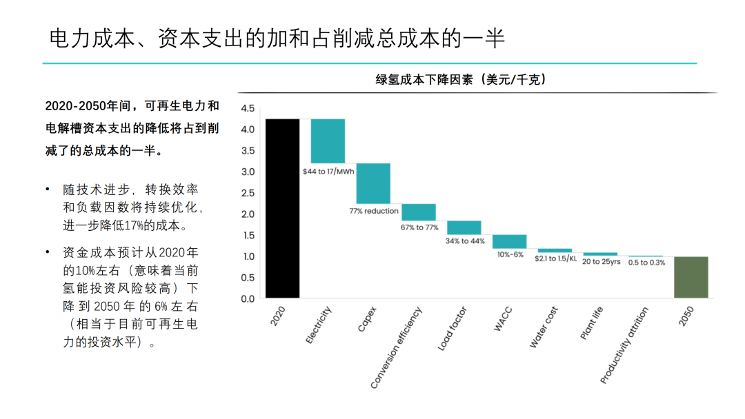 6. 到2050年,电力成本、电解槽投资成本的加和将占到削减了的总成本的一半,另外随转换效率和负载因数持续优化,贡献可达削减了的总成本的17%。