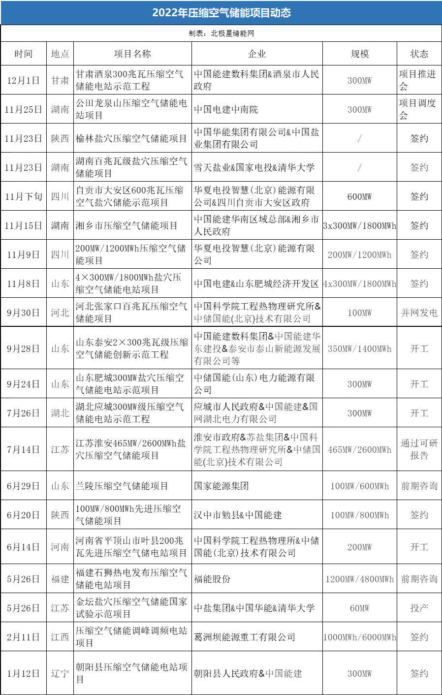近期,不断有企业入局压缩空气储能项目。据北极星储能网不完全统计,公开消息显示2022年截至目前已有19个压缩空气储能示范项目签约,已公开的储能规模可达6.48GW!仅11月就有6个压缩空气储能项目签约、1项开展项目调度会,而且首次出现在四川、湖南等省份!参与企业包括中储国能、中国能建、中国电建、国家能源集团、国家电投、中国华能、福能股份等。