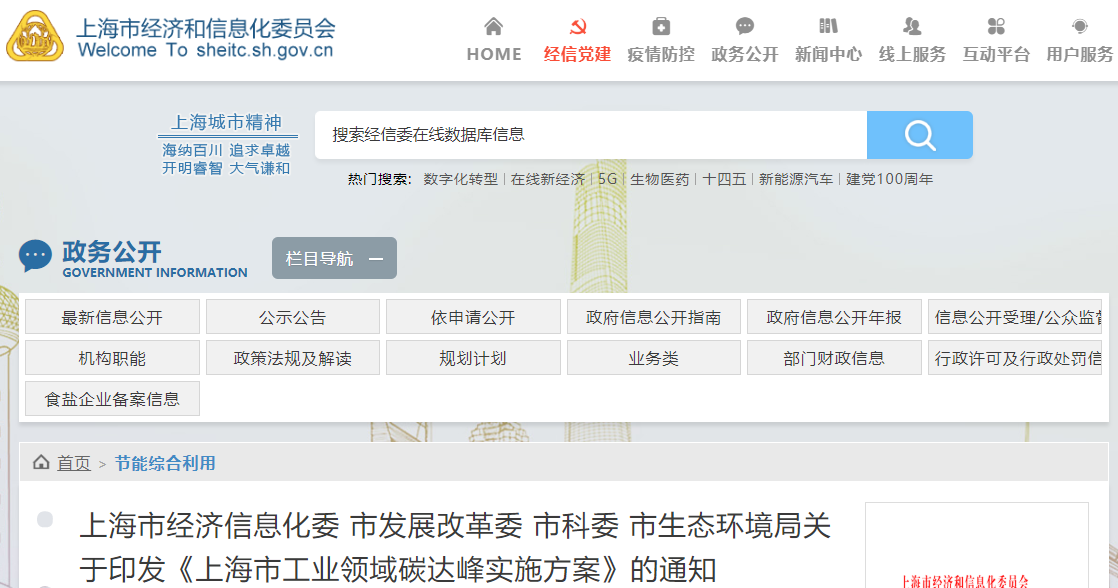 上海市经济信息化委 市发展改革委 市科委 市生态环境局关于印发《上海市工业领域碳达峰实施方案》的通知
