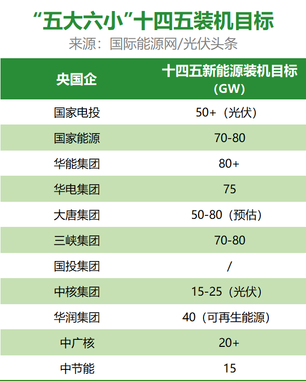 在能源转型方面,央国企的规划目标是宏大的,据国际能源网/光伏头条(PV-2005)统计“五大”能源央企规划新能源装机规模在357-387GW之间,“六小”豪门的装机目标在193-203GW之间。除了规划之外,风光大基地项目,整县推进也由央国企牵头,积极落实布局。