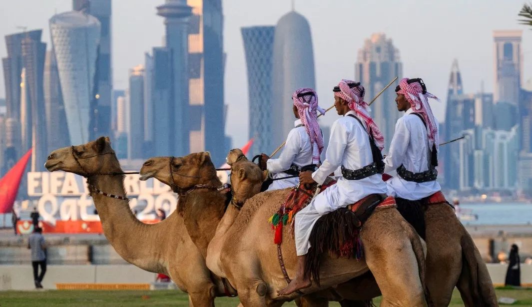 当地时间2022年12月15日,卡塔尔多哈,安全部队骑着骆驼沿着滨海大道散步,背景中可以看到现代摩天大楼的天际线。