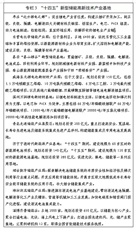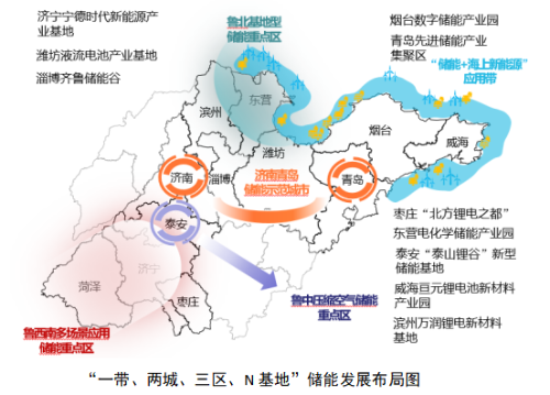 (六)培育一批特色鲜明的产业基地。聚焦储能产业链关键环节,立足区域优势,加快培育一批各具特色的产业聚集高地。在材料生产环节,重点打造枣庄“北方锂电之都”、东营电化学储能产业园、泰安“泰山锂谷”新型储能基地、威海亘元锂电池新材料产业园和滨州万润锂电新材料基地。在设备制造环节,重点打造青岛先进储能产业集聚区、济宁宁德时代新能源产业基地和潍坊液流储能产业园。在储能集成环节,重点打造山东电工电气储能产业基地和烟台数字储能产业园区。在相关服务环节,重点打造淄博齐鲁储能谷。