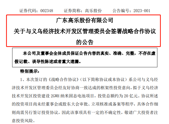 1月4日,高乐股份(002348.SZ)发布公告,公司与义乌经济技术开发区管理委员会于2022年12月31日签订《战略合作协议》,拟于义乌经济技术开发区投资建设2GWh纳米固态电池项目,投资总额约为20亿元。