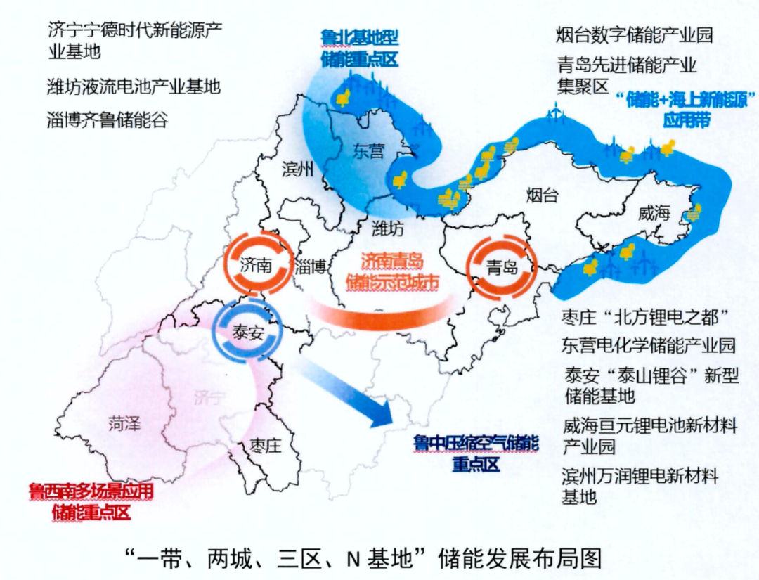 在12月底发布的《山东省新型储能工程发展行动方案》中,未来三年新型储能装机任务将遍布山东全省。明确定义为“一带、两城、三区,N基地”。
