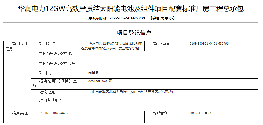 2021年8月,华润集团12GW高效异质结太阳能电池及组件制造项目在浙江舟山启动。项目包括24条500MW二代异质结太阳能电池生产装备线和24条500MW电池组件封装生产线等主体工程,总投资110亿元。2022年5月,该项目标准厂房项目招标,预计2025年建成达产。