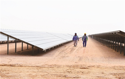 图:工作人员巡视马克图姆太阳能公园项目