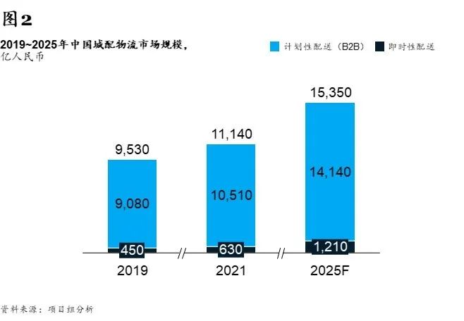 我国的公路物流业态主要可分为普货与专货两大类:专货对车辆有着特殊性能要求,市场相对小而专;普货领域则可进一步分为城际运输与同城配送。其中,运输距离小于150km的同城配送为轻型商用车最主要的应用场景。同城配送的运输场景可分为计划性配送和即时性配送两大类,其中计划性配送以B端客户为主,通常为卖场、集市、门店等定期从仓库取货的需求,以轻卡为主要配送工具。在上述同城配送的运输场景中,计划性配送(B2B)市场规模最大,2021年约达1万亿元人民币,且行业分散,前三大玩家的市场份额之和不足1%,潜力最大(见图2)。