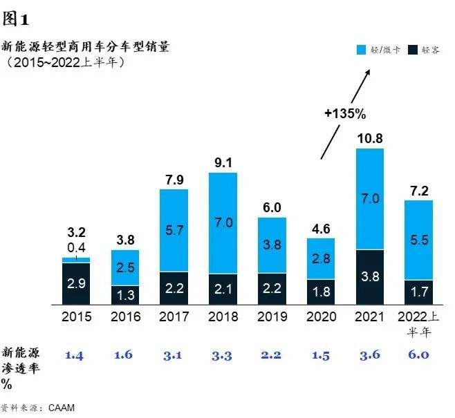 2021年,我国新能源轻型商用车销量已达约10.8万辆,较2020年增长近135%,新能源渗透率得以提升,2022年上半年渗透率达6%,创历史新高(见图1)。销量和渗透率的双重快速提升预示着爆发窗口的到来。在路权支持、补贴政策等短期政策因素,以及新能源车产品性能日趋成熟、应用场景增多、TCO(全生命周期成本)不断下降等长期因素的影响下,预计到2025年,新能源轻型商用车渗透率或超20%,迎来新能源化过程中的重大发展机遇。