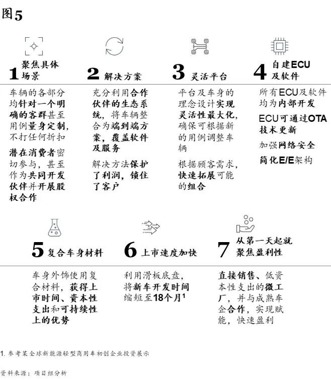 全球已涌现多家创新车企,他们从聚焦具体场景的定制化车型出发,通过运用灵活平台及车身设计、开发复合车身材料等产品创新,以及自建ECU(电子控制单元)及软件、提供端到端解决方案等运营及商业模式创新,挑战传统主机厂,抢占客户及市场(见图5)。