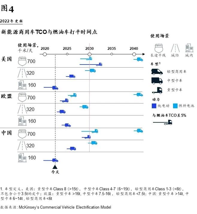 得益于整车成本持续下降、完善的补能体系和政府长期政策支持,中国市场新能源商用车TCO不断趋近燃油车,TCO优化趋势在全球范围内处于领先地位。在城配场景下,轻型商用车由于电池配置较少、多动能回收下单位里程能耗低,且可通过波谷充电等方式低成本补能,叠加燃油价格提升,TCO有望最快与燃油车打平;而在城际和干线场景下,由于需满足长距离运输和高速路况,车辆需要高电池容量,且使用过程中单位能耗高,快充成本高,TCO与燃油车持平需要更长时间(见图4)。