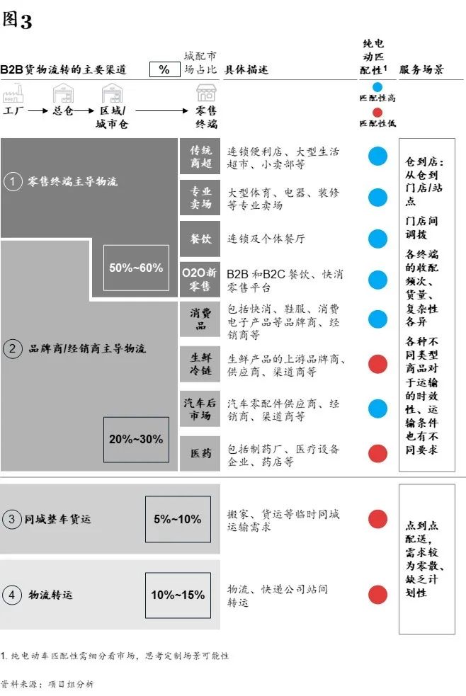 在B2B模式下,以传统商超、专业卖场、餐饮、O2O新零售等零售终端主导的物流需求占市场总需求的一半以上,主要为由“仓”到“店”的配送,以及不同门店间的货物调拨。大多数货品对运输条件的要求相对宽松,计划性强,纯电动车的可应用性高,是新能源轻型商用车可关注的重点场景。此外,由品牌商、经销商主导的物流为B2B模式下的另一大需求来源。其中部分细分领域,如生鲜冷链、医药等,对运输时效性及条件要求较高,纯电动车对传统特种燃油车的替代仍存在一定局限性;但在一些普通货品,如快消、鞋服、消费电子、汽车后市场零配件等一般货品的配送上,纯电车型仍有布局空间。而同城整车货运和物流转运多为点到点配送,需求较零散,缺少计划性,与纯电动车匹配性相对较低(见图3)。