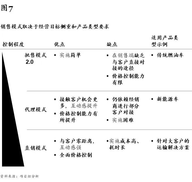 在传统的车企销售网络中,经销商不可或缺。但我们也看到,在全球部分领先创新商用车企中,已涌现出直销、代理等新模式。面向未来,主机厂可采用经销、代理及直销的混合渠道模式,积极探索,满足不同的经营目标侧重和产品类型要求(见图7)。