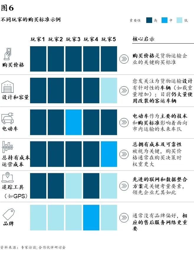 在产品开发中,鉴于物流行业高度的价格敏感性和场景差异性,车企需要围绕TCO设计车型和解决方案。由于主要市场场景不同,不同车队/客户对产品价格、设计和装载能力、电动或燃油、总持有成本/运营成本、追踪工具以及品牌等关键购买因素的偏好程度各有不同,但购买价格无一例外是最重要的购买决策因素。而随着企业运营成熟度的提升,对总持有成本及可靠性的考量将成为核心要素(见图6)。
