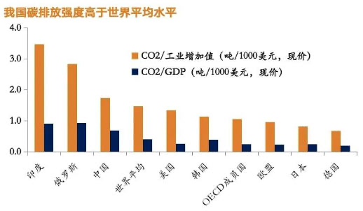 咱们国家单位能源的碳排放强度是世界平均水平的 1.3 倍,欧洲国家的 2.1 倍,就是因为我们在烧煤,人家在烧气。