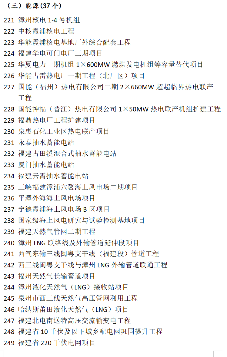 能源项目37个,包括三峡福建漳浦六鳌海上风电场二期项目(400MW)、平潭外海海上风电场项目(111MW)、宁德霞浦海上风电场B区项目(300MW)、国家级海上风电研究与试验检测基地项目4个风电项目。