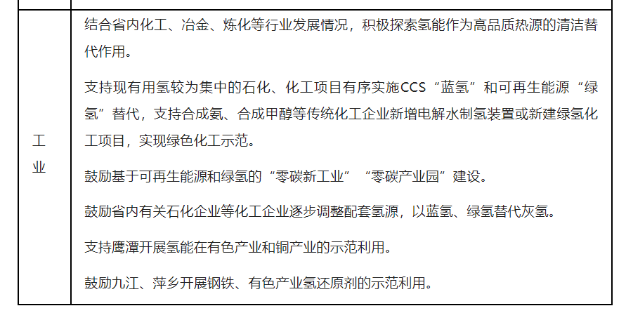 支持鹰潭、萍乡、景德镇、宜春等结合有色产业、铜产业集群发展规划和钢铁产业、陶瓷生产绿色转型、锂电产业融合等,探索氢能规模化应用,推进氢冶炼技术。