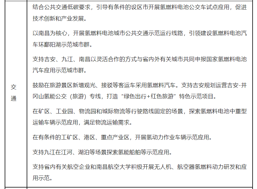 结合加氢网络建设和氢燃料电池技术发展,以对缩短燃料装填时间、延长终端续航能力要求高的应用场景为重点,有序开展氢燃料电池车辆示范应用。鼓励新增城市公交、环卫车和中重型货运车辆使用氢能。鼓励有条件的风景旅游区、会展中心等使用氢能接驳客车,探索在工矿区、港口、物流园、重点产业区示范应用其他类型的氢动力作业车辆,支持以氢能和其他清洁能源利用为重点打造氢能示范小镇、产业园等。支持氢燃料电池和氢燃料混合动力在轨道交通、船舶领域应用。鼓励依托现有航空产业基础开展氢动力在航空器、无人机领域示范应用。支持吉安、九江、南昌等城市结合本地及周边区域氢能产业建设情况,与省内外有关城市合作申报国家氢燃料电池汽车应用示范城市群。