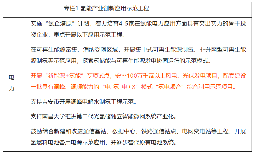 实施“氢企燎原”计划,鼓励有实力的能源企业在赣搭建氢能产业投资平台,重点开展氢能在电力领域应用试点和投资,积极推广试点成效,促成赣鄱大地氢能燎原之势。重点促进可再生能源与氢能相互支撑、高效发展相关应用。结合新能源规模化发展和新型电力系统建设,鼓励开展“氢电耦合”和氢储能等示范应用,发挥氢能在促进可再生能源消纳、电网调峰等方面的作用。开展“新能源+氢能”专项试点,引导建设一批与风电、光伏发电配套的“氢电耦合”综合利用示范项目,培育一批具有相关产品研发、设计、生产和工程建设能力的本土骨干企业。鼓励在通信基站、数据中心、铁路通信站点、电网变电站等基础设施场所使用氢能作为应急备用电源,提升设备供电可靠性。因地制宜布局氢燃料电池分布式发电和热电联供设施,推动在有需求、有条件的区域开展“冷、热、电、氢”多能融合互补利用示范,提升终端能源效率和低碳化水平。