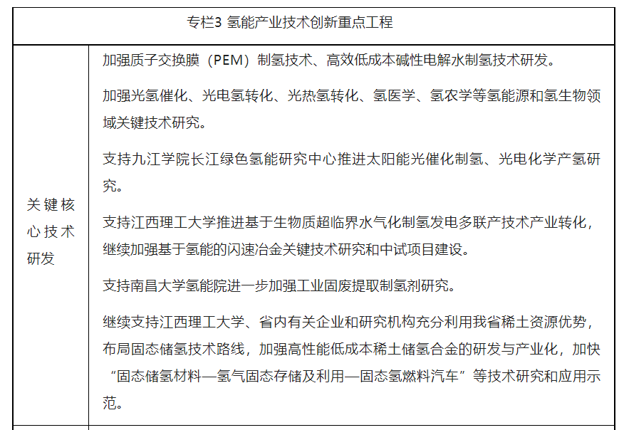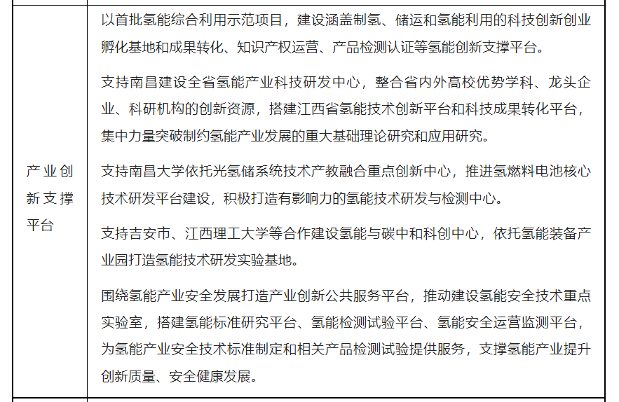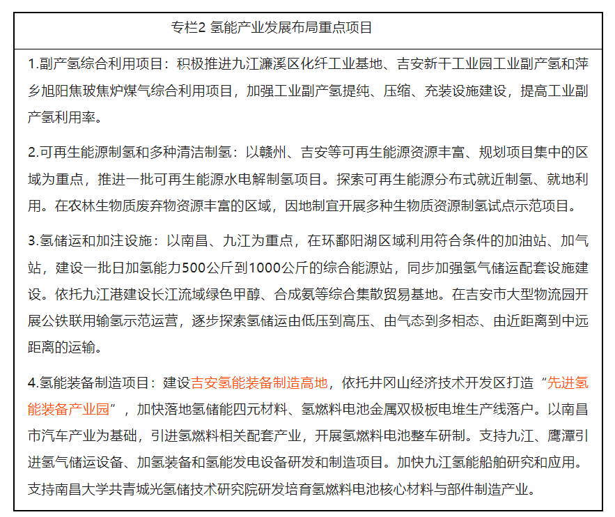 氢能装备制造项目:建设吉安氢能装备制造高地,依托井冈山经济技术开发区打造“先进氢能装备产业园”,加快落地氢储能四元材料、氢燃料电池金属双极板电堆生产线落户。以南昌市汽车产业为基础,引进氢燃料相关配套产业,开展氢燃料电池整车研制。支持九江、鹰潭引进氢气储运设备、加氢装备和氢能发电设备研发和制造项目。加快九江氢能船舶研究和应用。支持南昌大学共青城光氢储技术研究院研发培育氢燃料电池核心材料与部件制造产业。