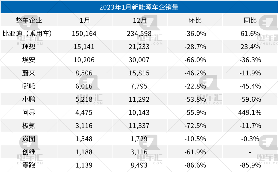 不过从今年1月份已经公布了销量数据的企业来看,开局并不顺利,多家新能源车企交出了同比、环比双下滑的成绩。据乘联会预估数据,1月新能源乘用车厂商批发销量41万辆,环比12月约下降45%,同比2022年1月基本持平。