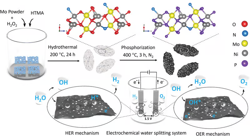 具体而言,RMIT的设备使用了一种由氮掺杂的磷化镍(NiMo3P)片制成的新型催化剂。在每个片状层中都有大量孔隙,旨在加速催化活性和质量转移。