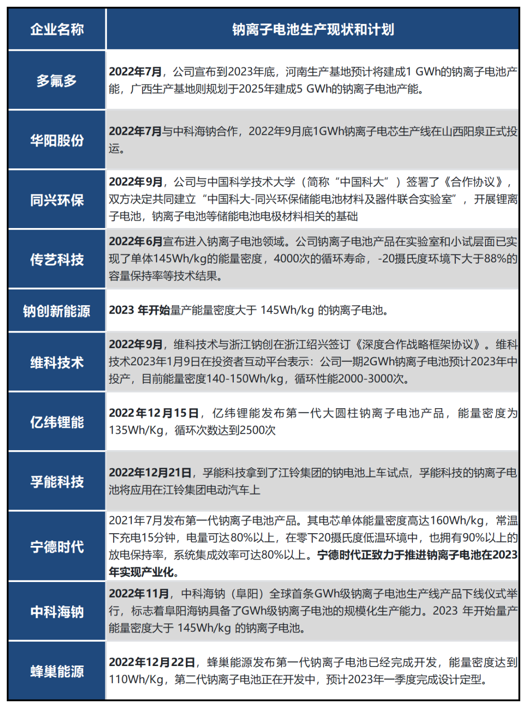 2022年至今钠离子电池项目、产品、规划屡见不鲜(详见下表),2023将成为钠离子电池元年的呼声甚嚣尘上。