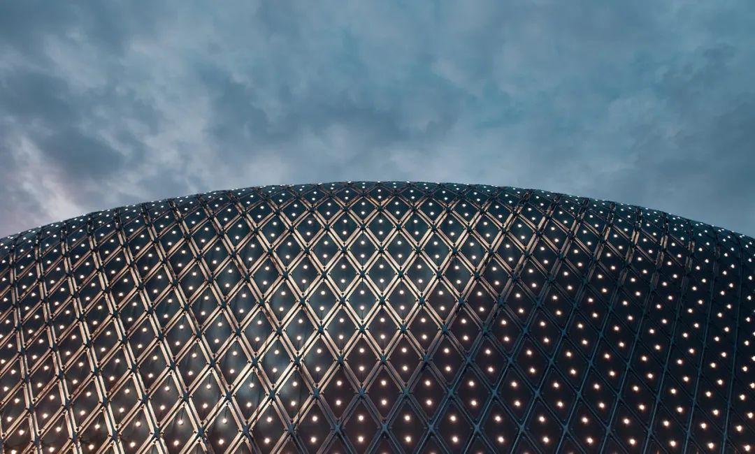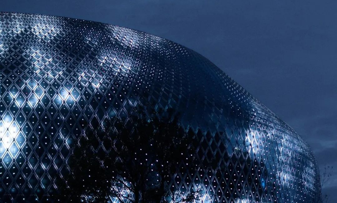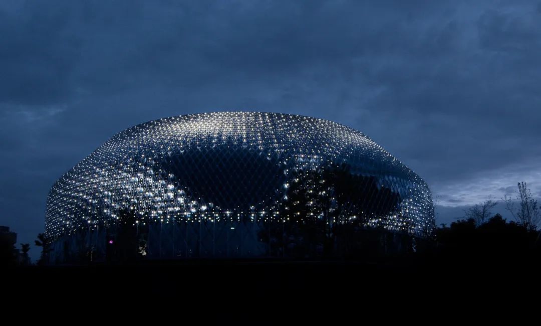 展馆被巨大、半透明的媒体立面所覆盖,在夜间亮起30000多颗由太阳能电池供电的LED单元,仿佛是科幻大片里才有的场面。