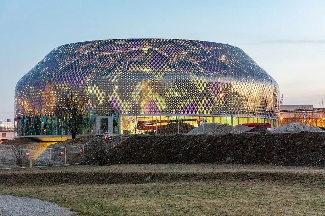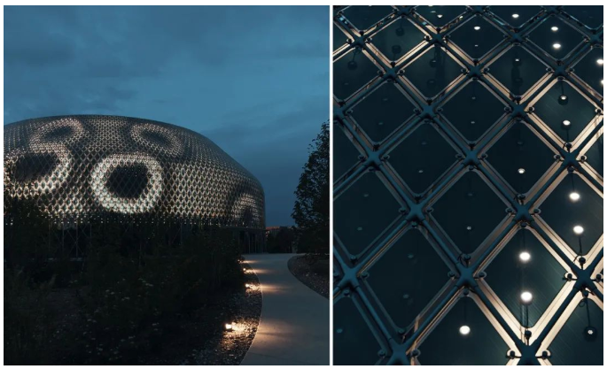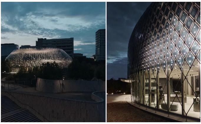 诺华展馆的设计灵感来自于具有聚合精神的圆形平面体系与人体细胞,其独特的媒体立面成为展馆最大的创新亮点,并在2023年德国设计奖的“优秀建筑”类别中获得金奖,2022年欧洲最佳奖的“设计”类别中获得铜牌,2022年 LIT 照明设计奖的“外部建筑照明”类别中获得冠军。