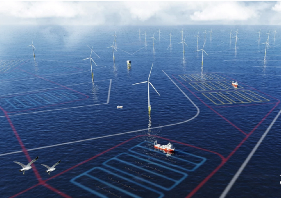 North Sea Farm 1位于荷兰一个海上风电场内,利用风电机组之间的空地进行海藻种植,旨在测试和改进海藻养殖方法,同时研究海藻吸收二氧化碳的能力。