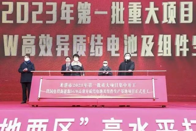 2023年1月1日上午,龙港市举行2023年第一批重大项目集中开工暨国电投新能源5GW高效异质结电池及组件生产基地项目开工仪式,擂响全市项目建设的“行军鼓”,吹响龙港高质量发展的“冲锋号”。该项目总用地面积440亩,总建筑面积约21.87万平方米,总投资超50亿元,计划于2023年9月完成一期竣工。