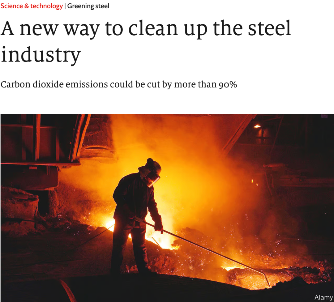 《经济学人》发表文章,题目是:A new way to clean up the steel industry(钢铁行业清洁化的新方法)。