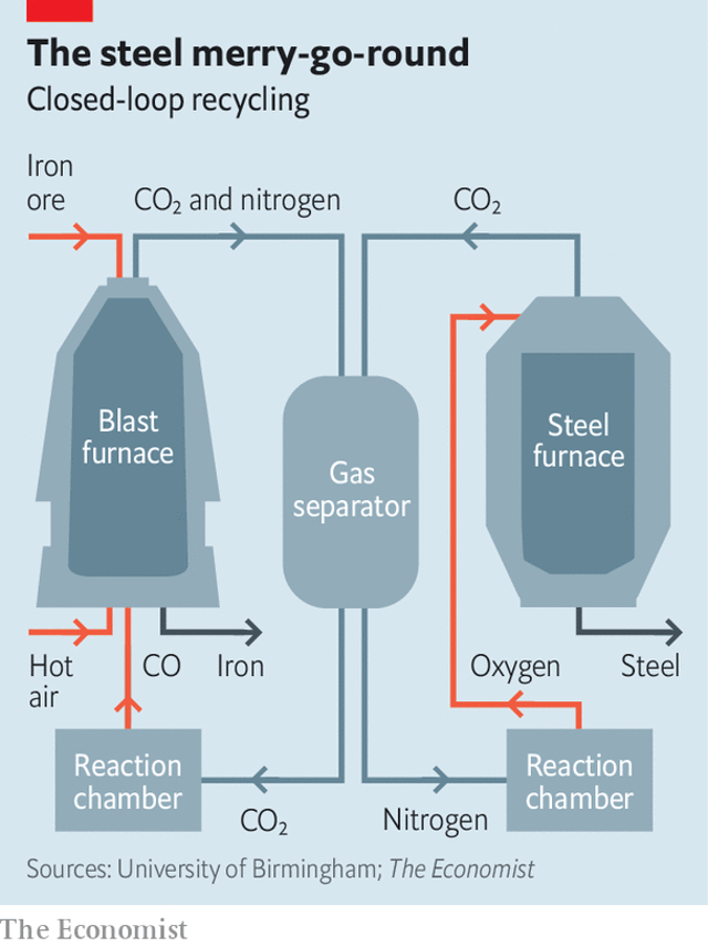 丁博士和基尔达尔博士建议采用闭环的碳循环系统来替代大部分焦炭。按照现有的工艺,焦炭和矿石在一个类似于塔的高炉内交替分层堆积,吹入加热到1200°C以上的空气。在此温度下,焦炭中的碳与空气中的氧反应生成一氧化碳;然后这种气体与矿石中的氧发生反应,在一个称为还原的过程中释放铁。这个过程所涉及的各种反应产生的热量使熔炉的温度高于铁的熔点(1538°C),由此产生的液态金属从塔底部流出。同时,二氧化碳和其他气体包括残余氮气从顶部排出。