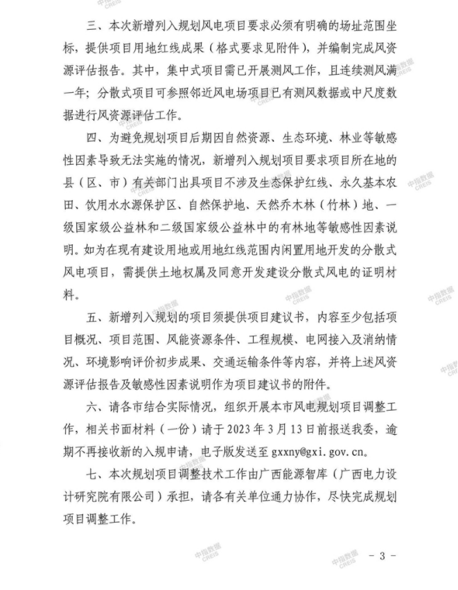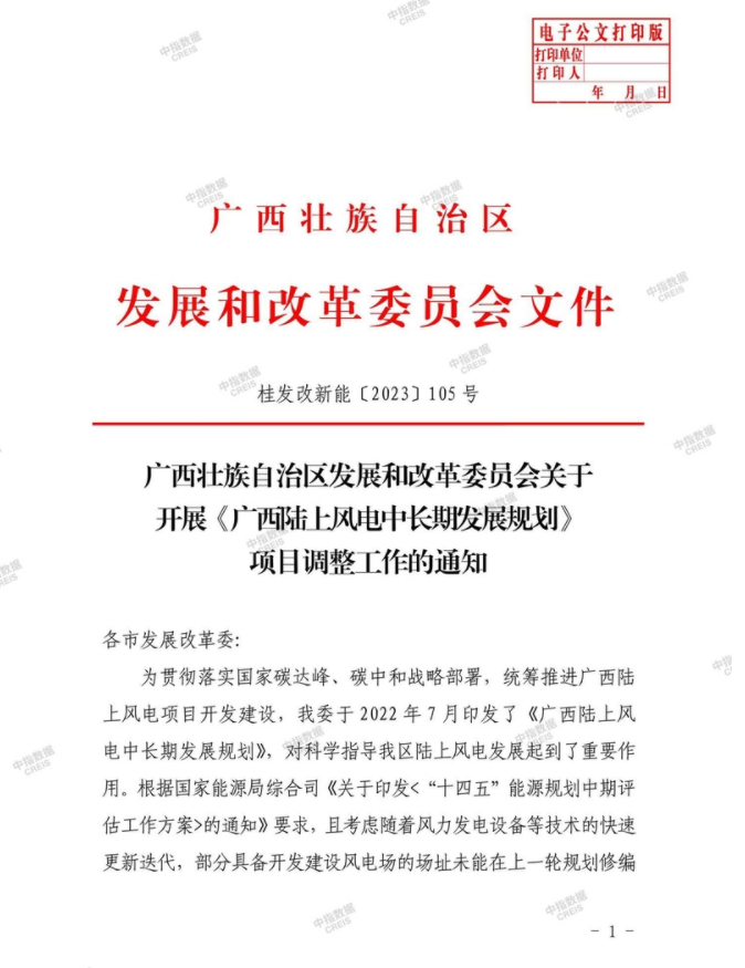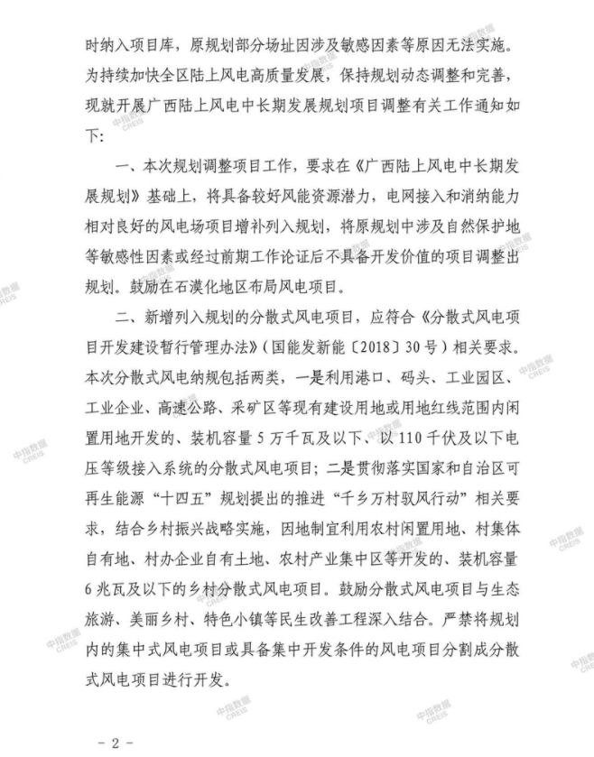 近日,广西壮族自治区发展和改革委员会发布关于开展《广西陆上风电中长期发展规划》项目调整工作的通知。《通知》指出,本次规划调整项目工作,要求在《广西陆上风电中长期发展规划》基础上,将具备较好风能资源潜力,电网接入和消纳能力相对良好的风电场项目增补列入规划,将原规划中涉及自然保护地等敏感性因素或经过前期工作论证后不具备开发价值的项目调整出规划。鼓励在石漠化地区布局风电项目。
