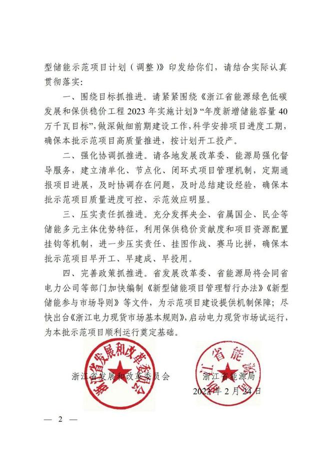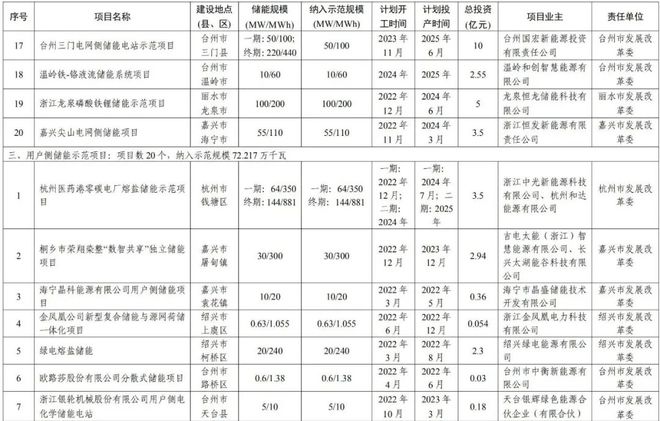 其中,电网侧储能示范项目列表中去掉宁波杭湾建中变储能电站项目,新增嘉兴尖山电网侧储能项目;用户侧储能示范项目去掉浙江LNG三期项目配套液态空气储能示范项目、浙江吉安天子湖热电有限公司熔盐储能零碳综合功能示范项目,新增西子洁能崇贤基地智慧储能电站项目、临平区浙北换流站新型储能电站等12个储能示范项目。