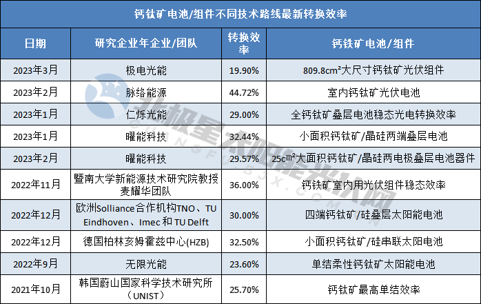 钙钛矿电池/组件不同技术路线最新转换效率一览: