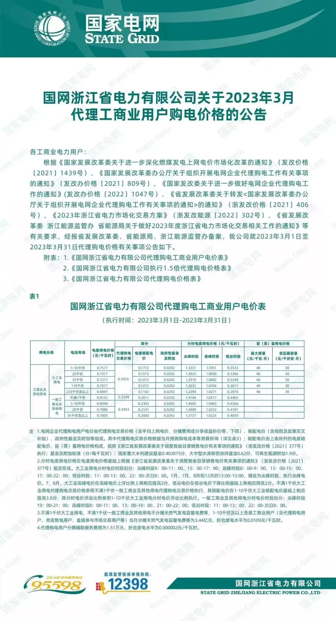 2023年,浙江省工商业用户代理购电价格再次更新,通过查询2023年3月浙江省代理购电价格如下图: