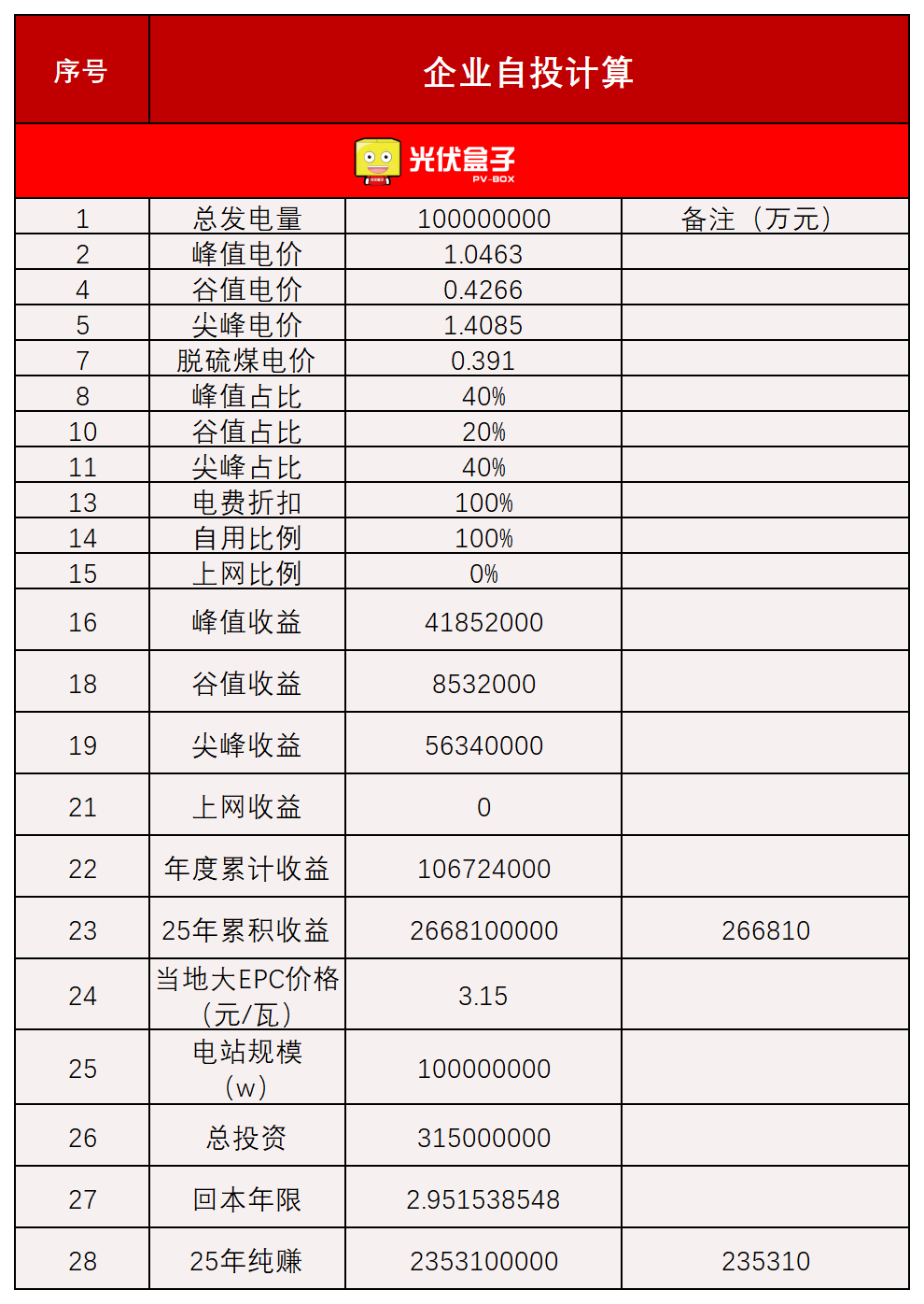 光伏电站部分总成本3.15亿元,25年收益26.681亿元,回本年限约2.95年: