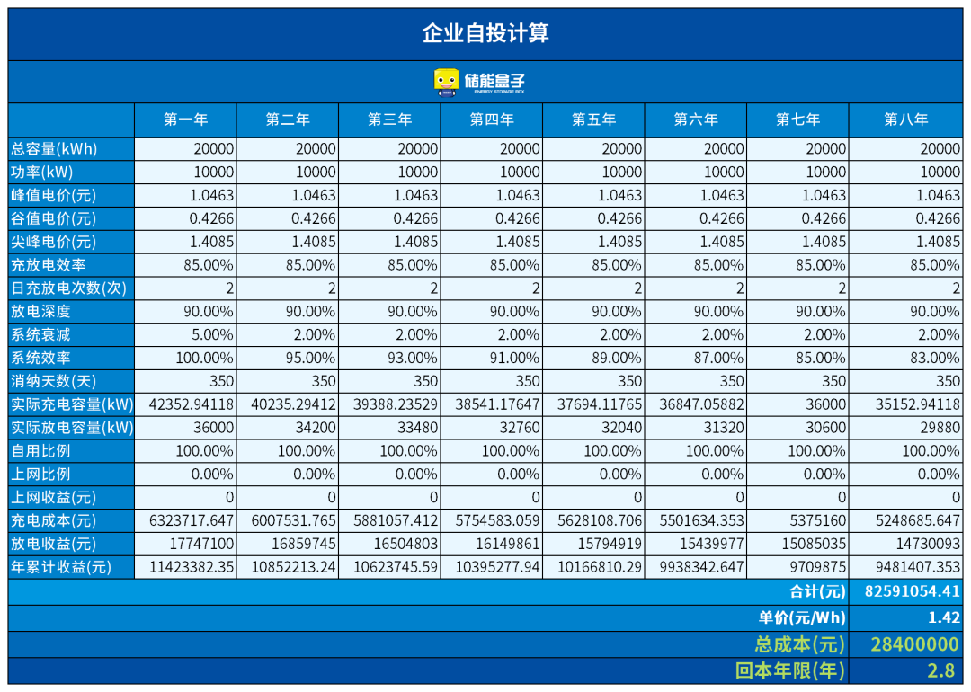 储能电站部分总成本为2840万,前8年总收益约8259万元,回本年限为2.8年:
