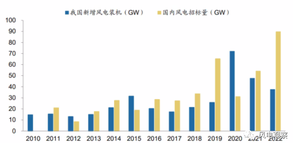 风电观察统计,2022年我国风电招标量突破历史高点,公开招标量达89.8GW(不含EPC和框架)同比增幅在65%+,其中,陆风招标76.7GW,海风招标13.1GW,按照风电项目建设周期推算,风电招标领先装机约一年,2023年有望成为风电装机大年。